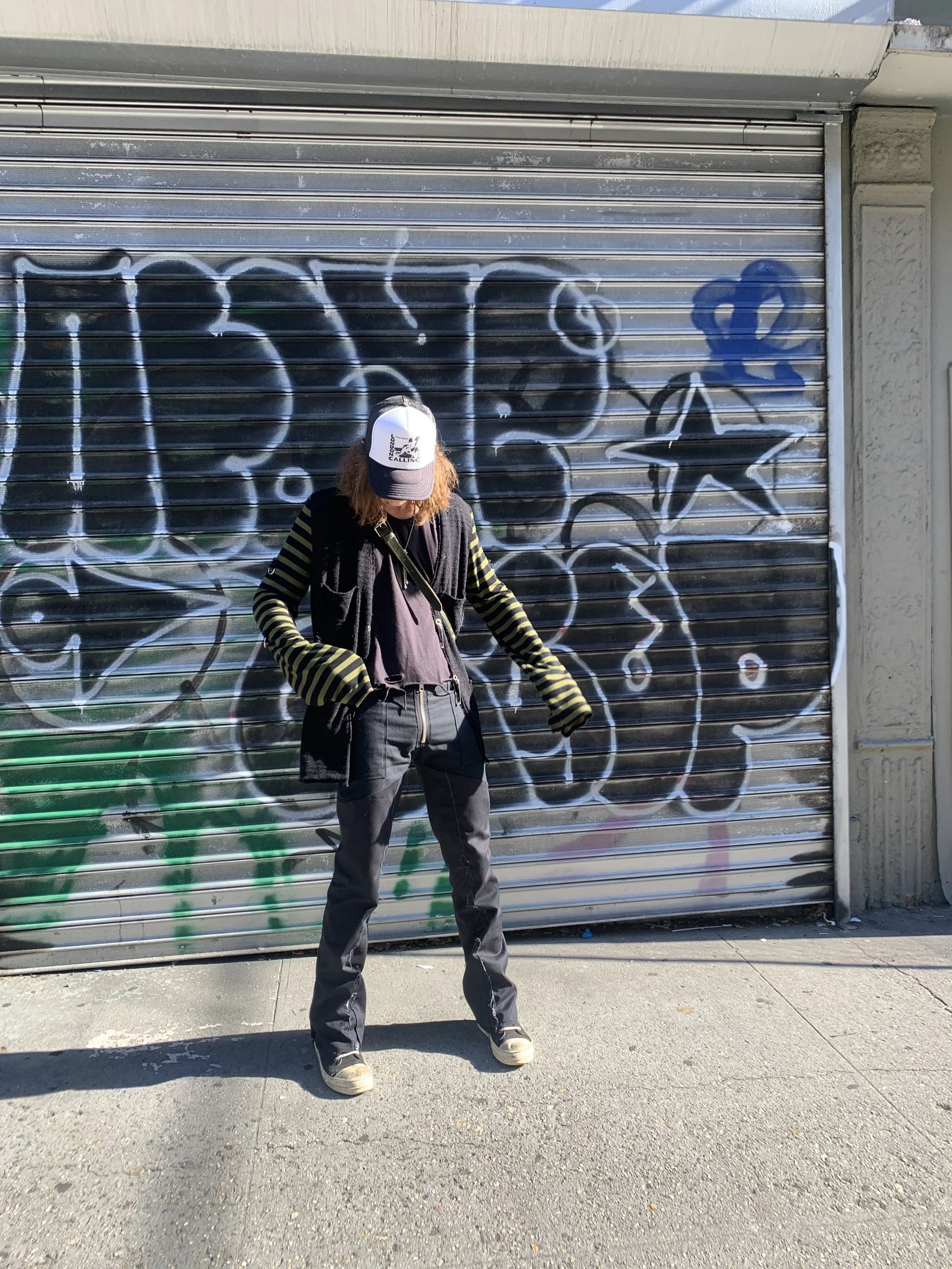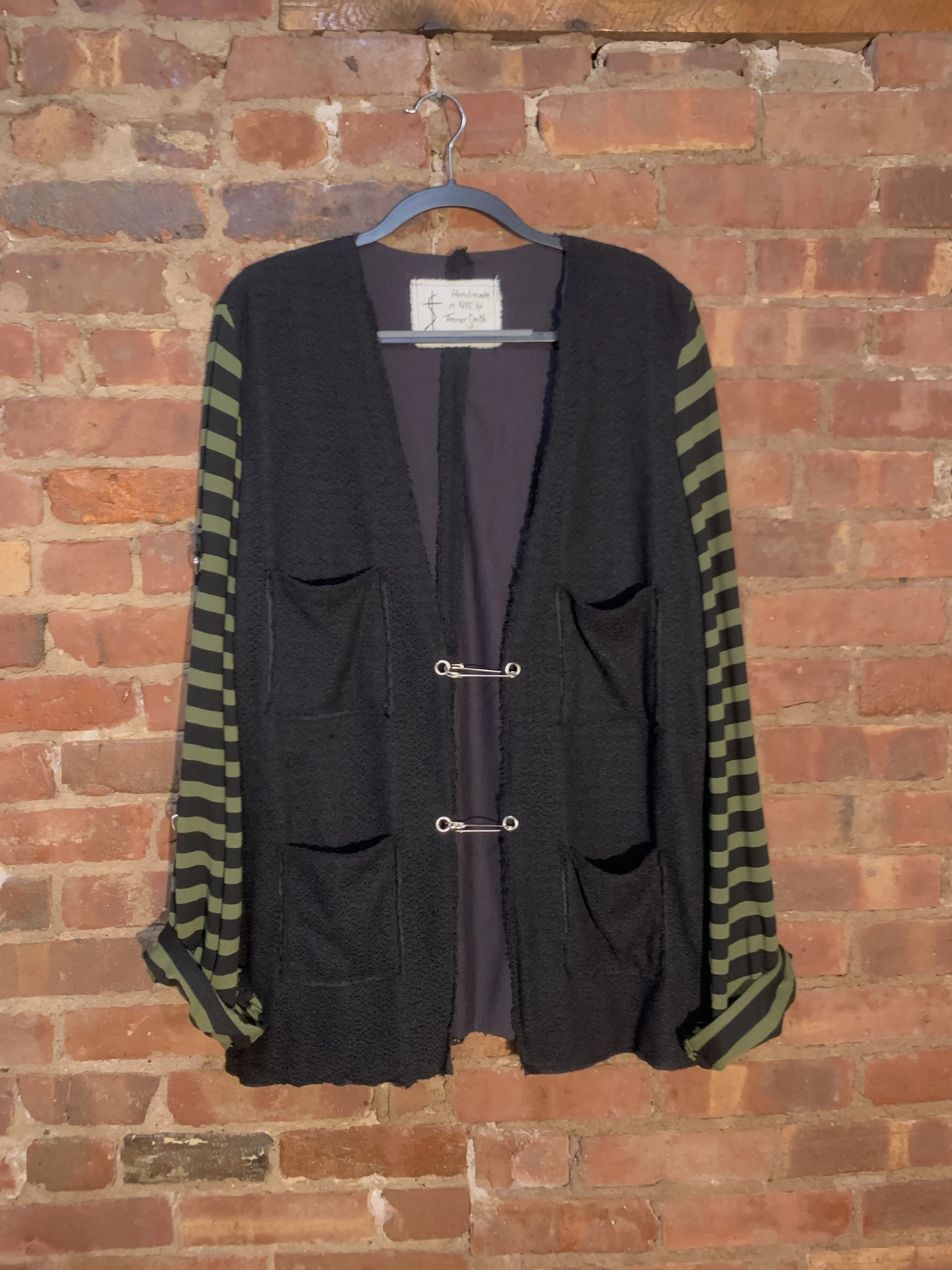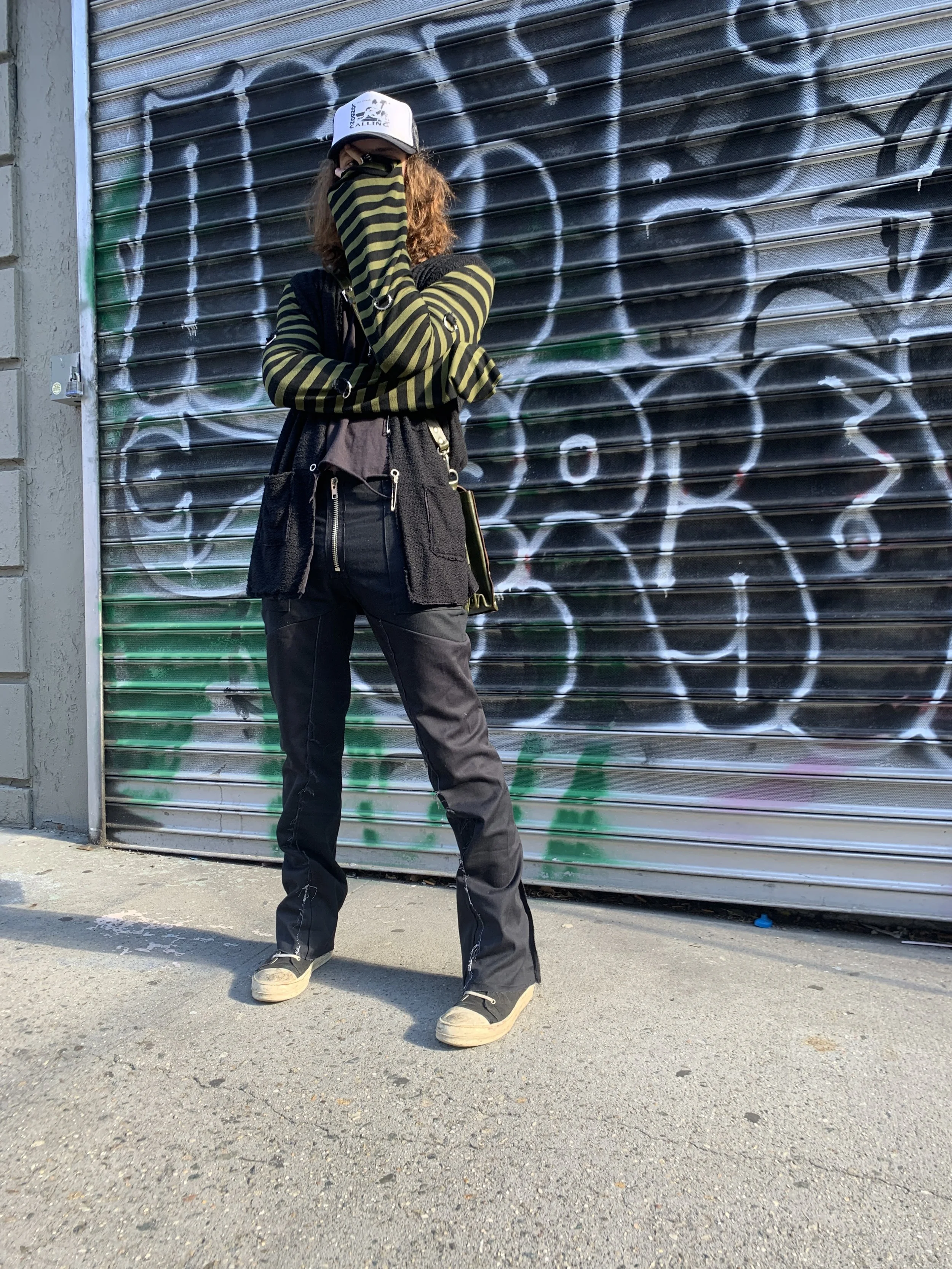 Made from recycled cotton jersey and cotton knit scraps from my previous collection, “Blitzkrieg”. Oversize safety pin closure. Styled with “Flat Circles” tank top and “Icarus” flared pants.