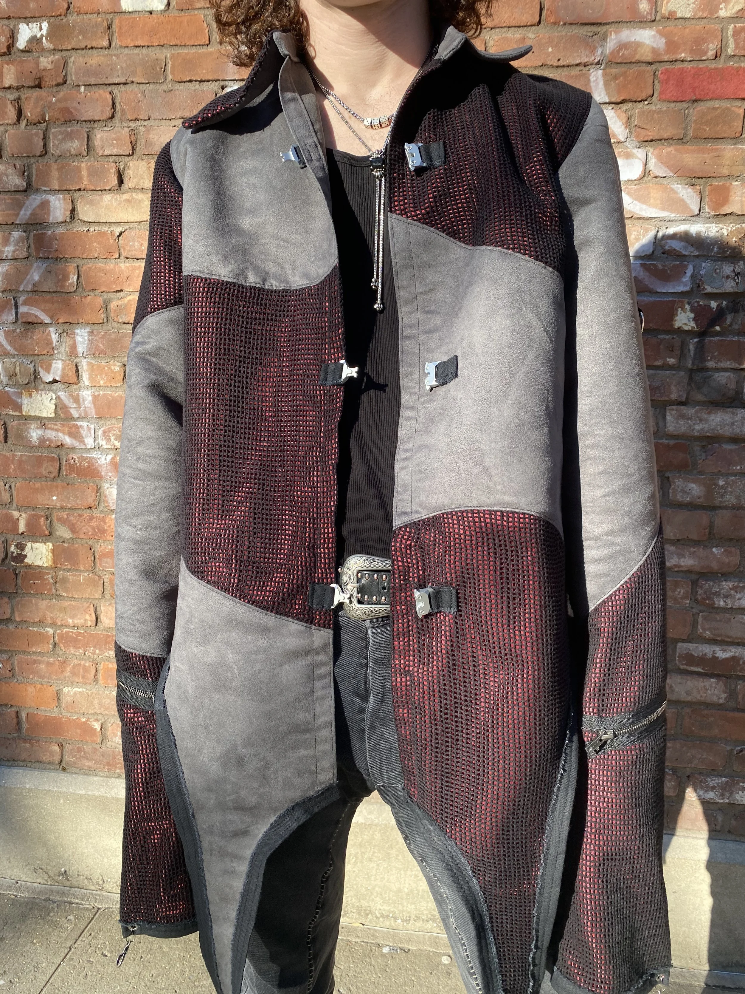 First piece created from my 2021 collection focused on emotional masochism titled “Flat Circles”. Fabricated with black cotton mesh layered over maroon cotton sateen contrasted against grey poly faux suede. Fastened shut by three rollercoaster buckles. Sleeve able to be worn in two ways.