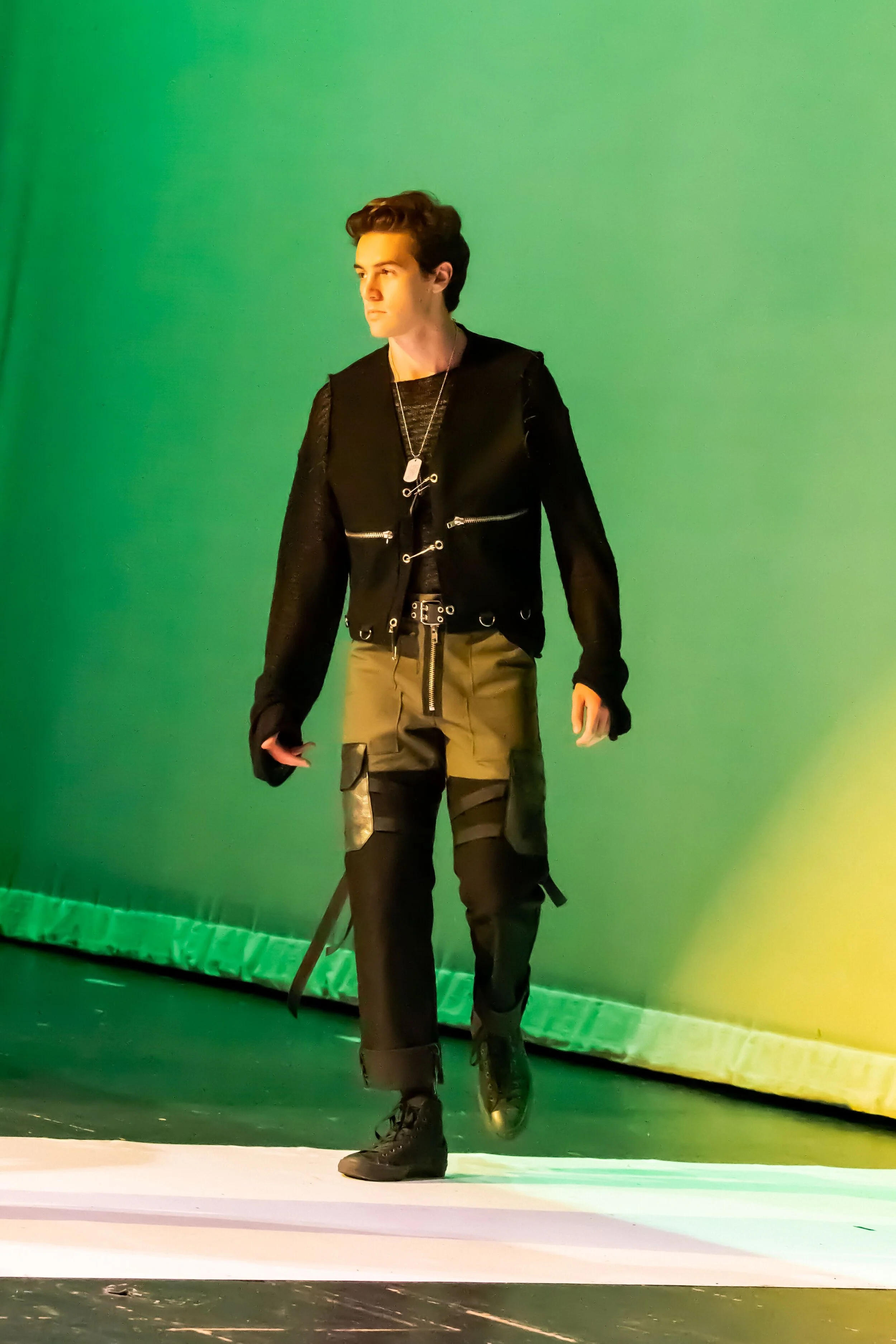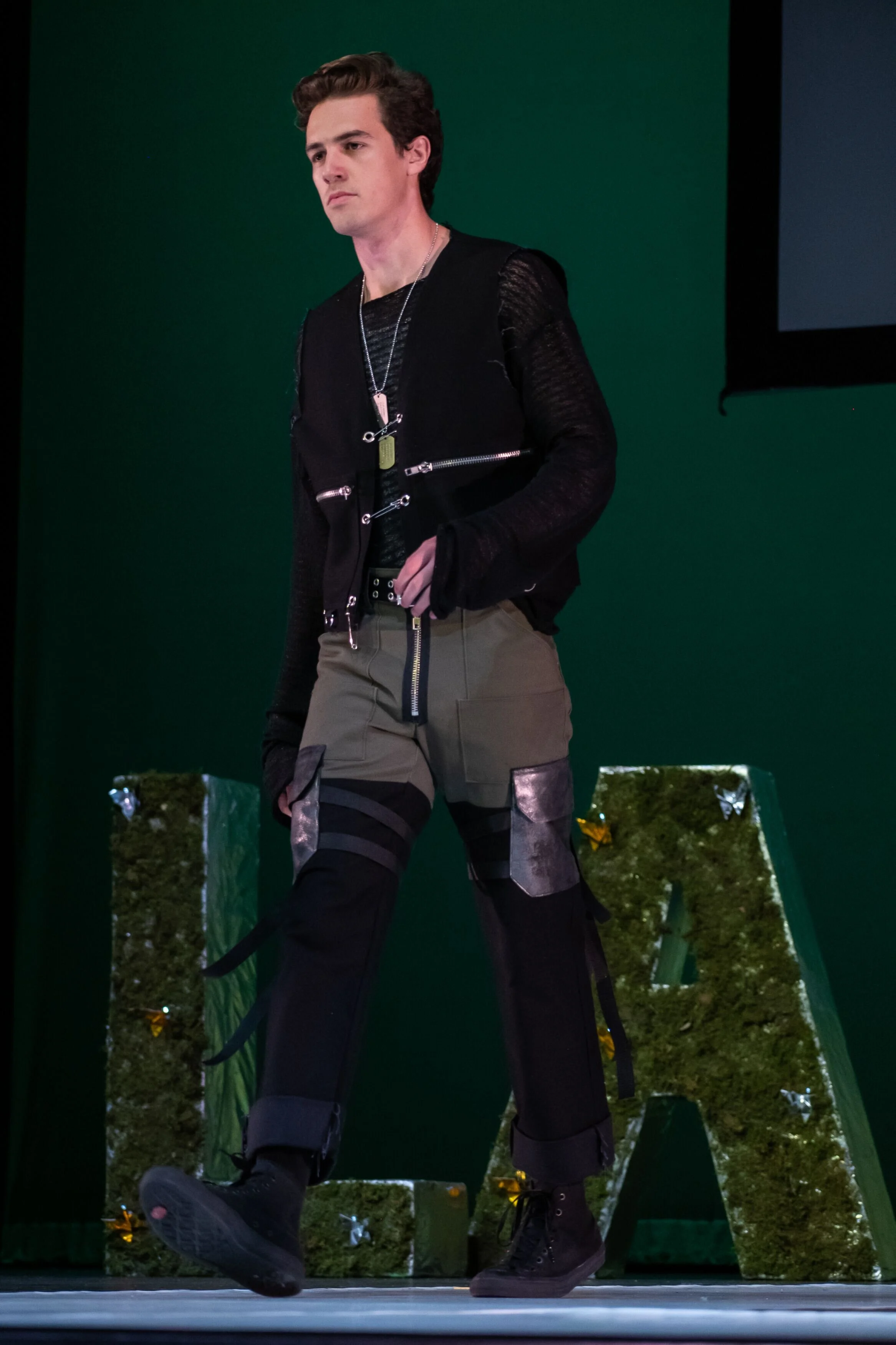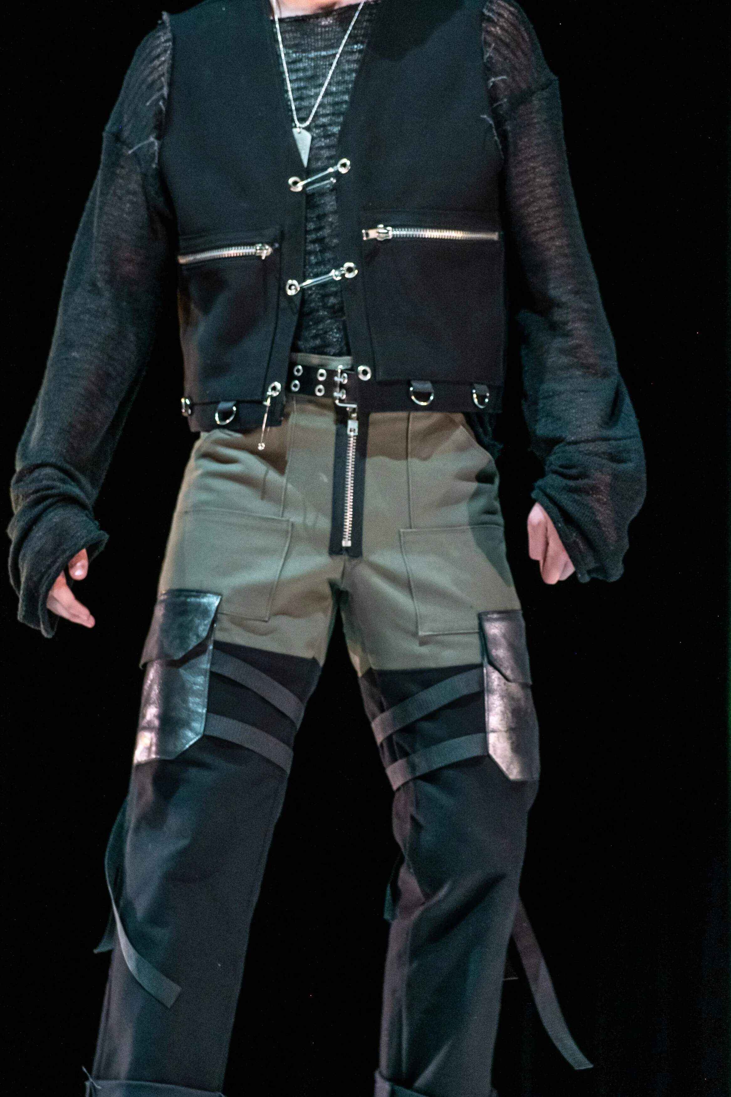 This collection is inspired by vintage military uniforms and the outfits worn by characters from Japanese video games I played growing up. I used durable textiles such as black and olive cotton canvas, foil infused calf leather, and silver hardware such as zippers, grommets, and oversized safety pins to mimic the textiles and details used in military uniforms as well as some of the outfits worn by these video game characters.
