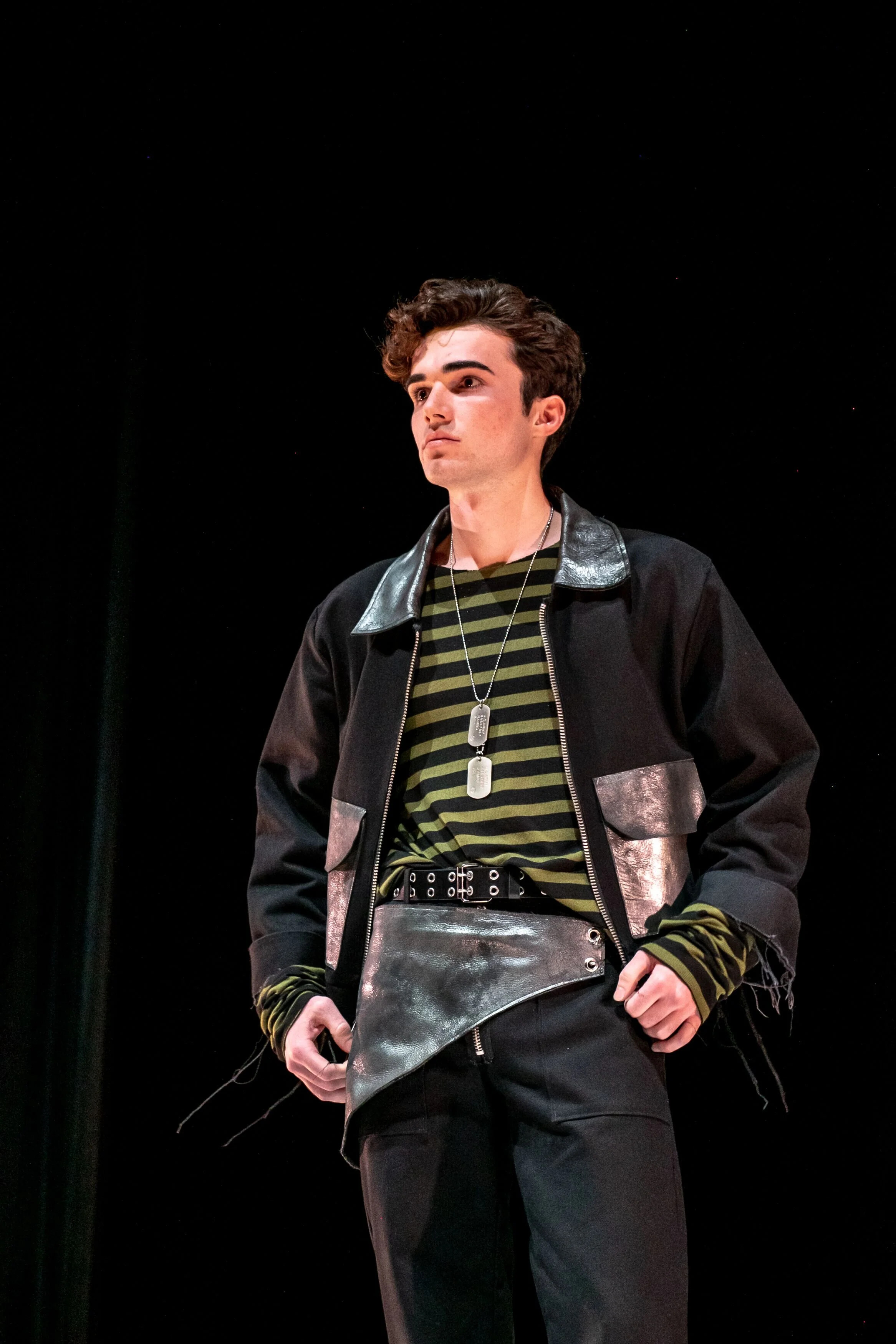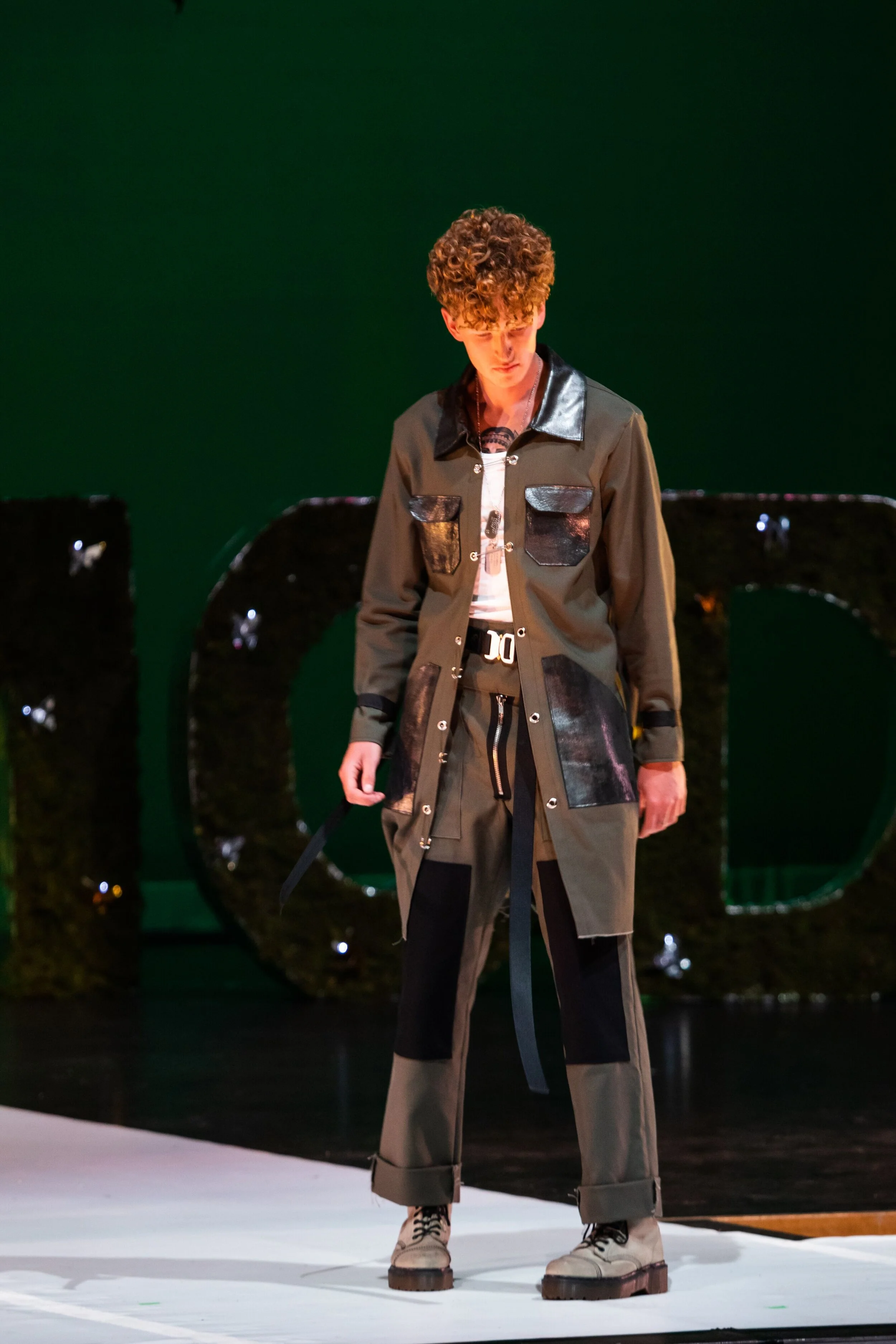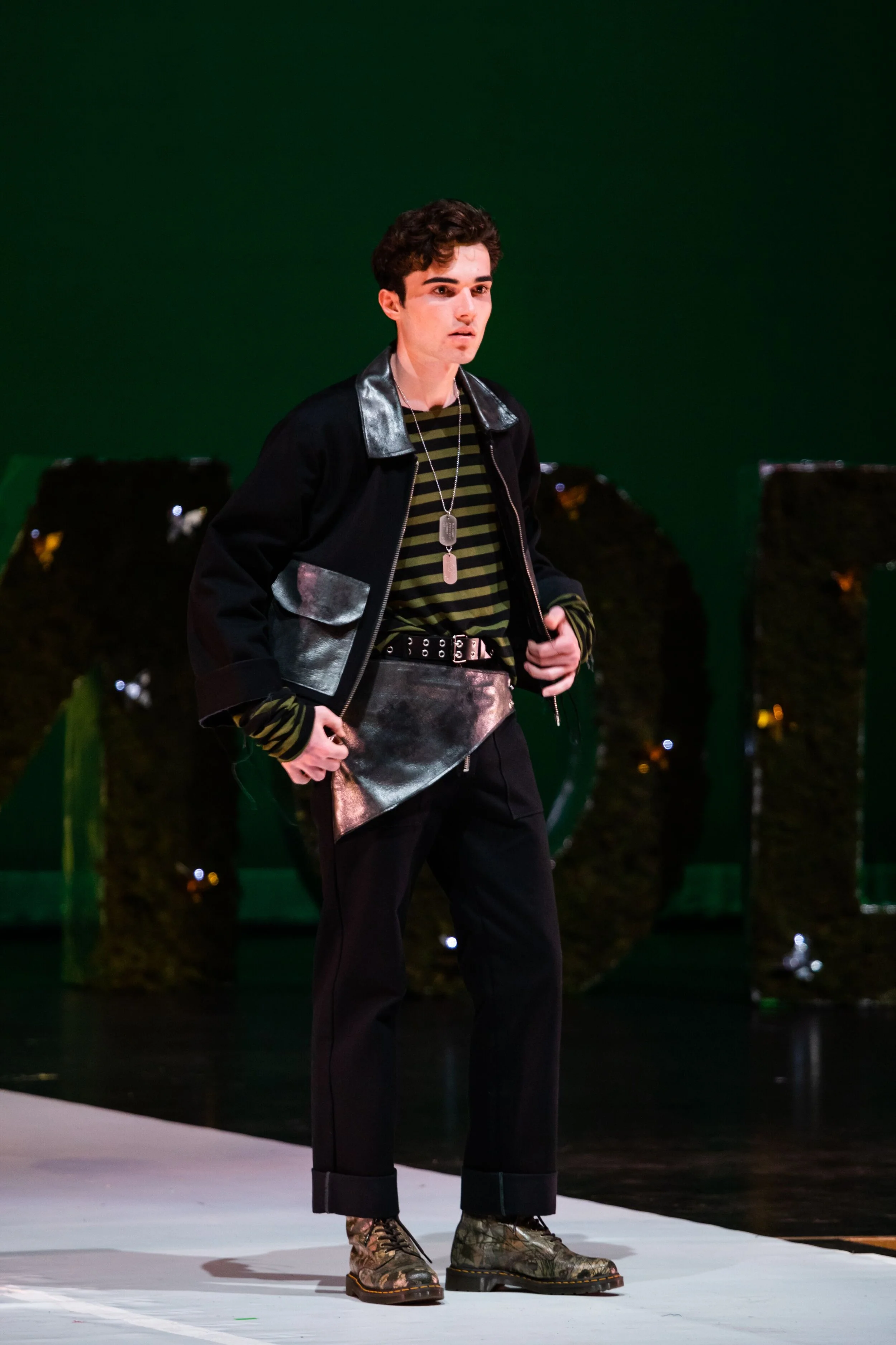 This collection is inspired by vintage military uniforms and the outfits worn by characters from Japanese video games I played growing up. I used durable textiles such as black and olive cotton canvas, foil infused calf leather, and silver hardware such as zippers, grommets, and oversized safety pins to mimic the textiles and details used in military uniforms as well as some of the outfits worn by these video game characters.